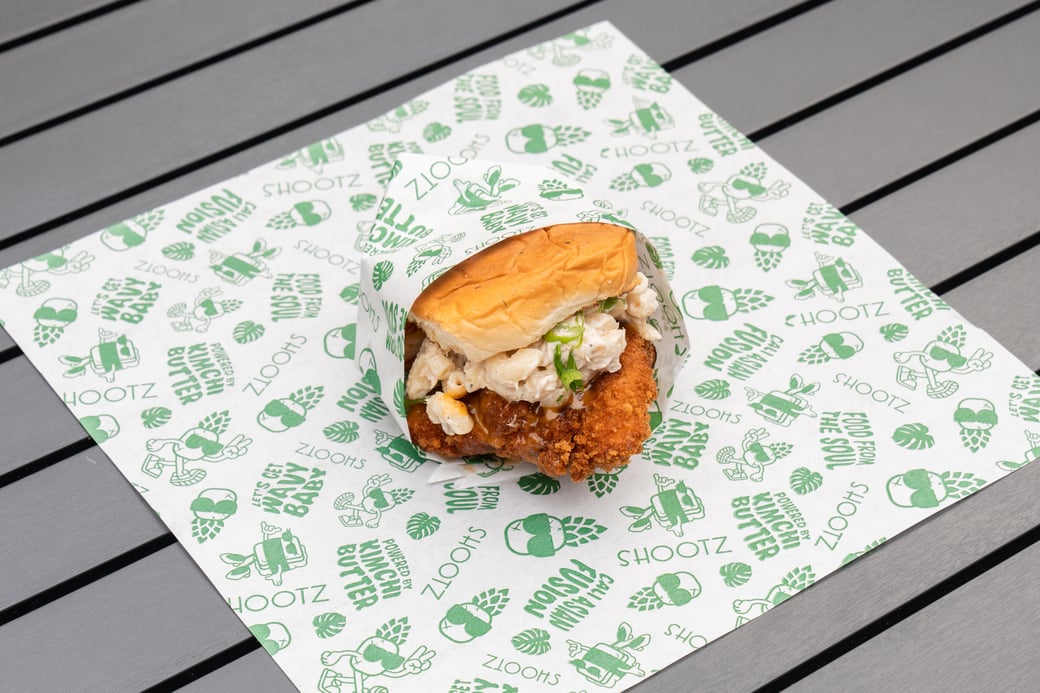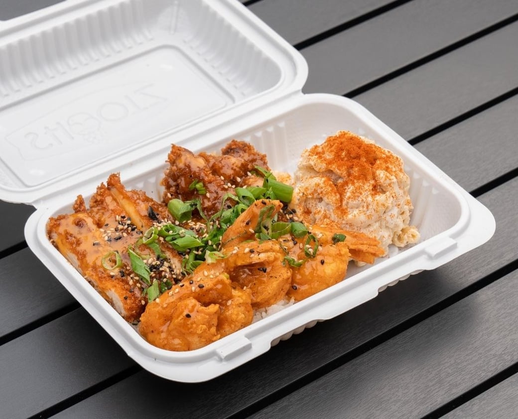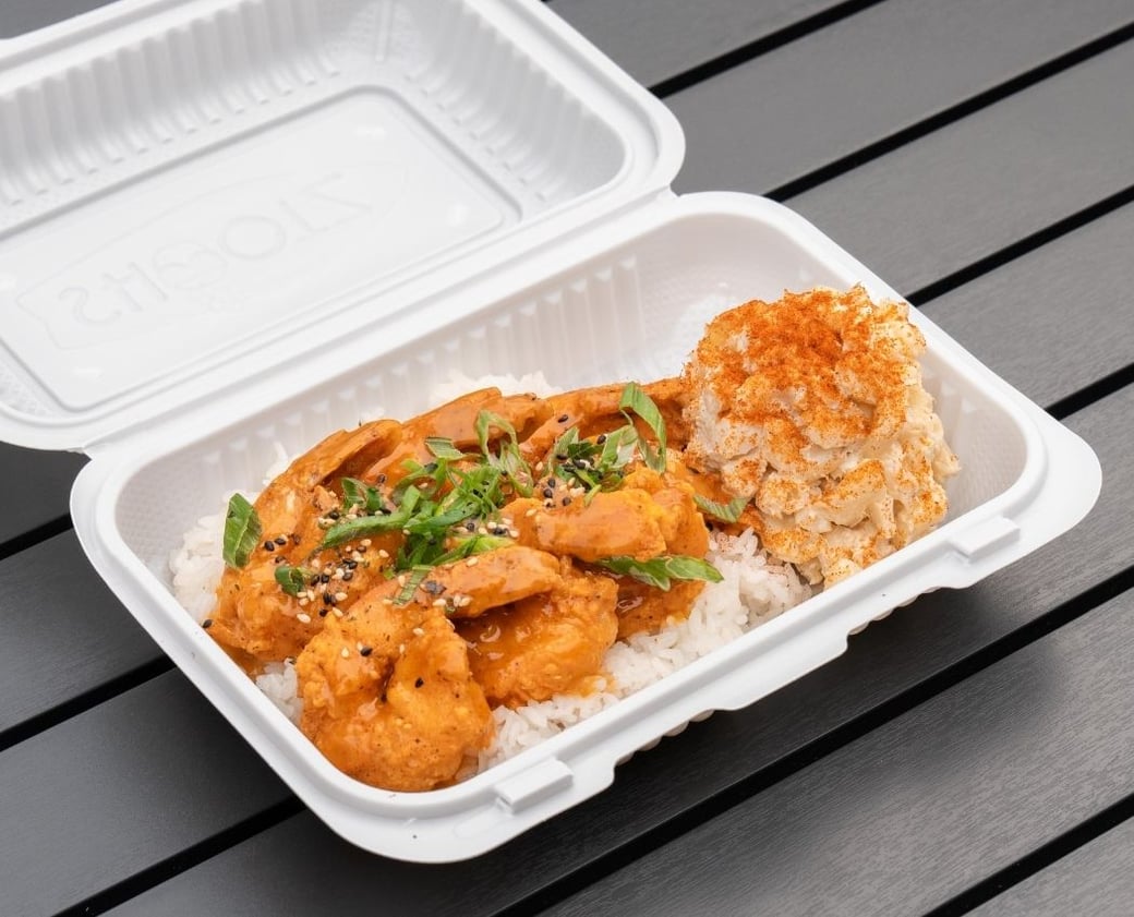 Our signature delicious and crisp Kimchi Butter Katsu Chicken served on a moist toasted Hawaiian bun. Topped with our creamy Kimchi Aioli, signature Macaroni Salad, and brûlée’d brown sugar.
